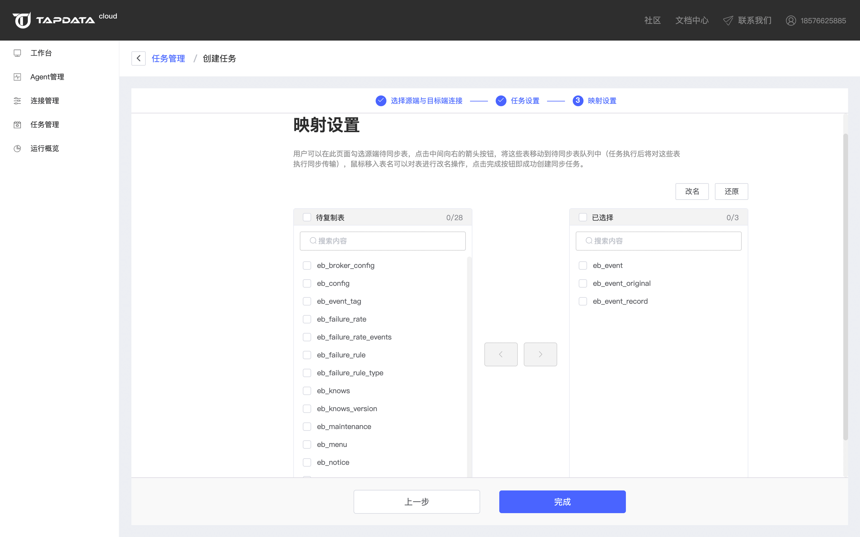 选择您所需要的同步的库、表,如果您对表名有修改需要,可以通过页面中的表名批量修改功能对目标端的表名进行批量设置,需要注意的是目前 Tapdata Agent 免费版仅支持单库数据同步。