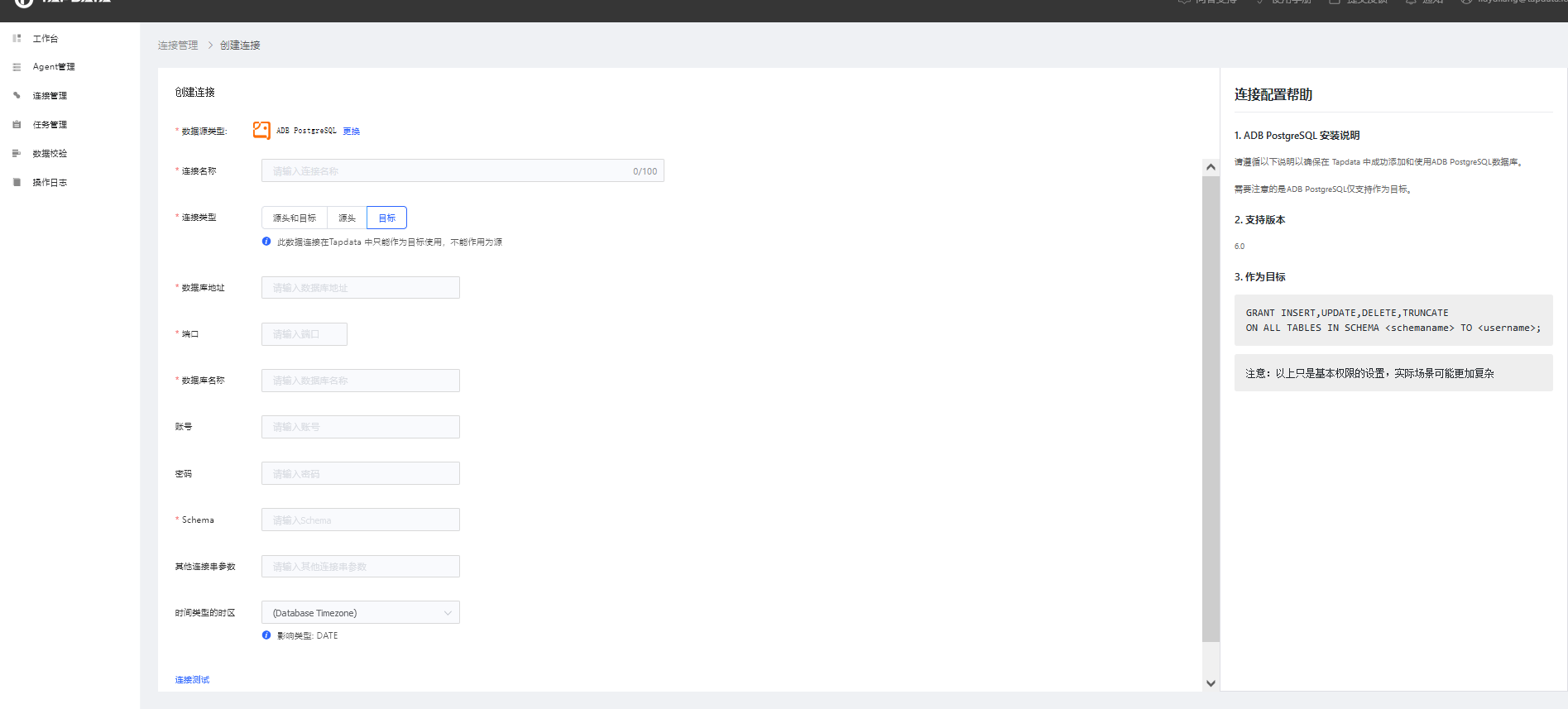 点击左侧菜单栏的【连接管理】,然后点击右侧区域【连接列表】右上角的【创建连接】按钮,打开连接类型选择页面,然后选择 ADB PostgreSQL。