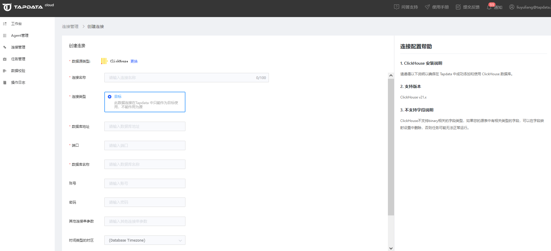 点击左侧菜单栏的【连接管理】,然后点击右侧区域【连接列表】右上角的【创建连接】按钮,打开连接类型选择页面,然后选择 ClickHouse。