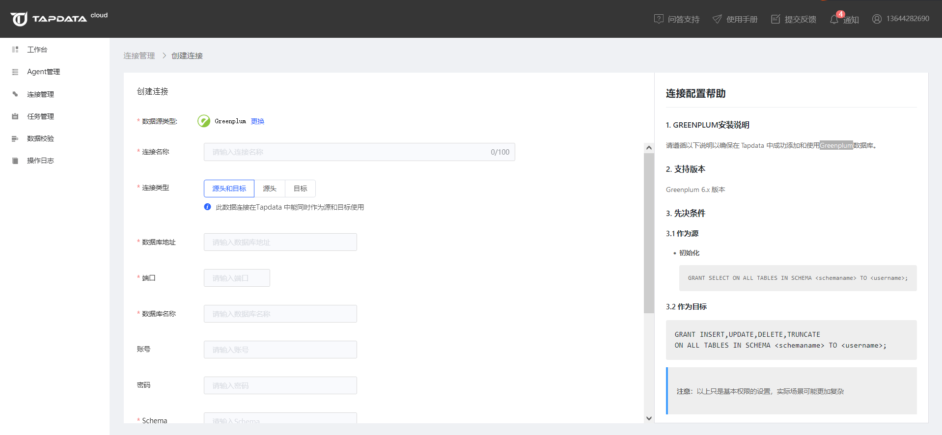 用户指南连接数据库连接 Greenplum版本:2.x连接 Greenplum 点击左侧菜单栏的【连接管理】,然后点击右侧区域【连接列表】右上角的【创建连接】按钮,打开连接类型选择页面,然后选择 Greenplum。 在打开的连接信息配置页面依次输入需要的配置信息,配置完成后测试连接保存即可。
