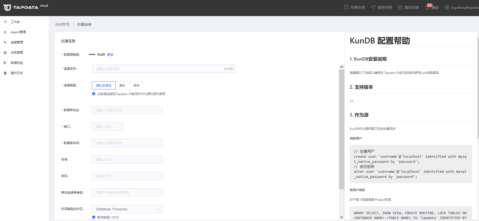 点击左侧菜单栏的【连接管理】,然后点击右侧区域【连接列表】右上角的【创建连接】按钮,打开连接类型选择页面,然后选择 KunDB。