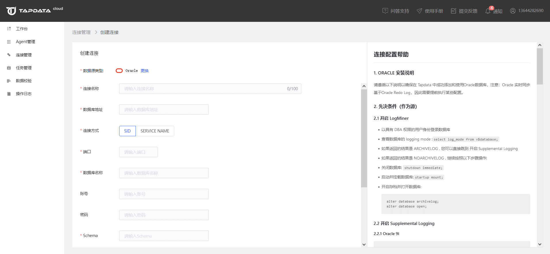 点击左侧菜单栏的【连接管理】,然后点击右侧区域【连接列表】右上角的【创建连接】按钮,打开连接类型选择页面,然后选择Oracle