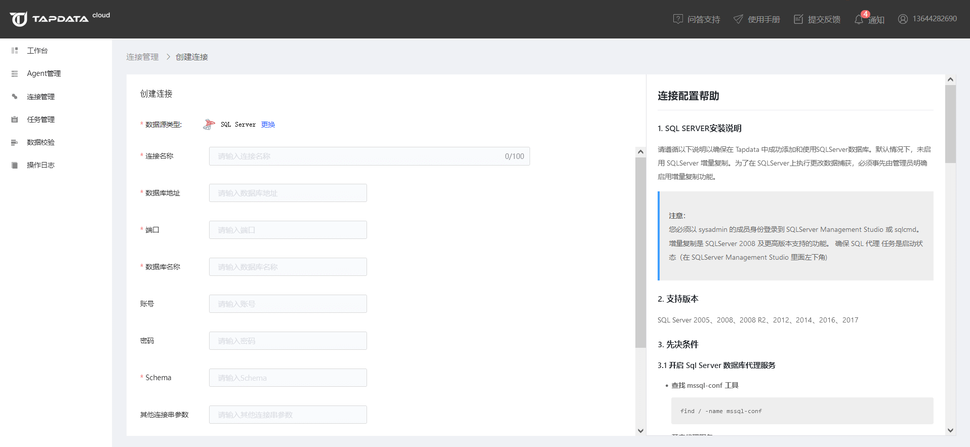 点击左侧菜单栏的【连接管理】,然后点击右侧区域【连接列表】右上角的【创建连接】按钮,打开连接类型选择页面,然后选择SQL Server