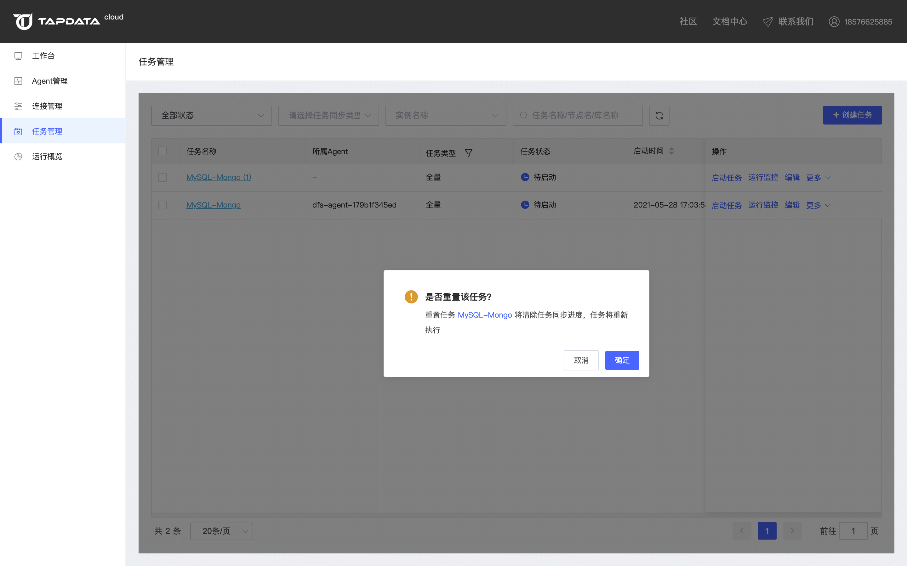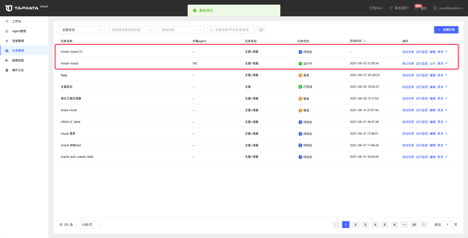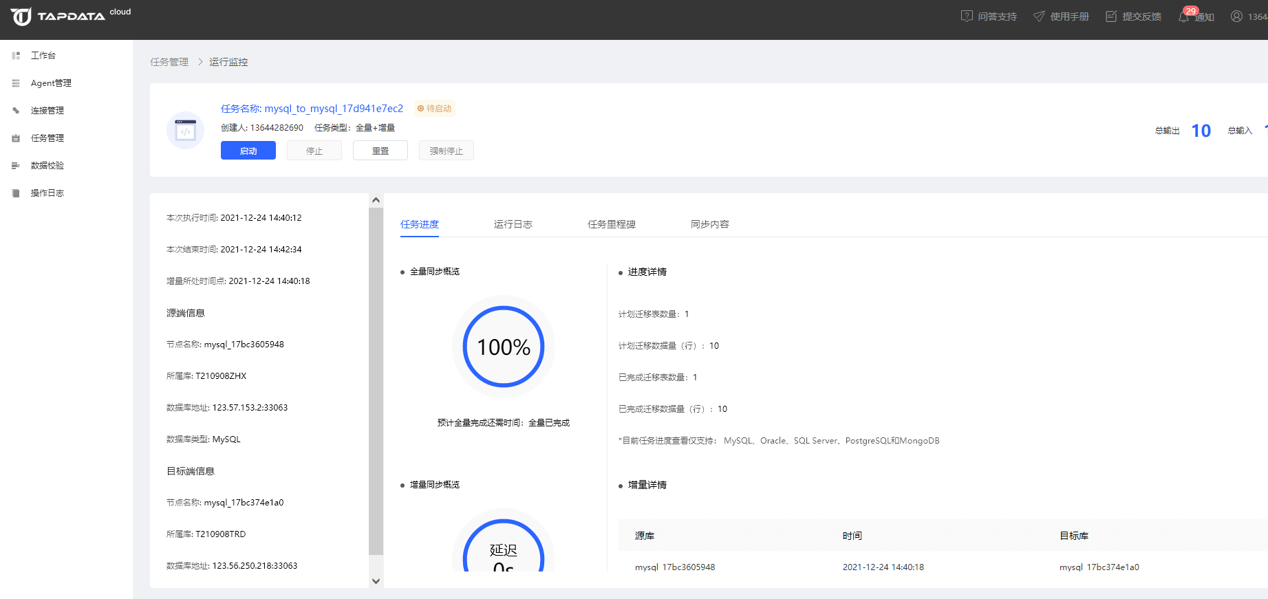 用户指南数据复制管理任务版本:2.x本页总览管理任务 任务创建完成后,您可以在任务列表中对任务进行监控和管理操作。 运行监控 单击任务操作栏的运行监控,即可打开任务执行页面,可查看任务执行的具体信息。 可查看到任务进度、运行日志、连接、历史运行记录、同步内容等信息。 编辑任务 点击任务编辑页面,可以对任务的内容和配置进行编辑调整。 复制任务 通过【复制】操作可以快速复制一个任务 重置任务 点击【重置】可以将任务同步进度清除 删除任务