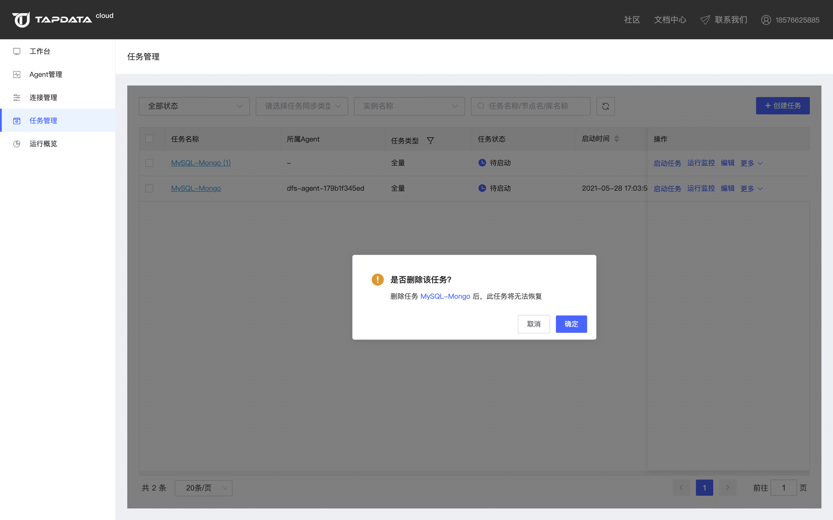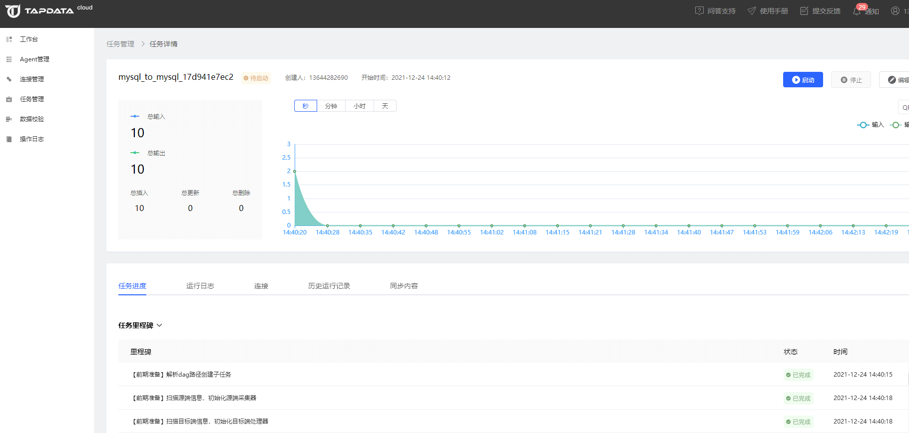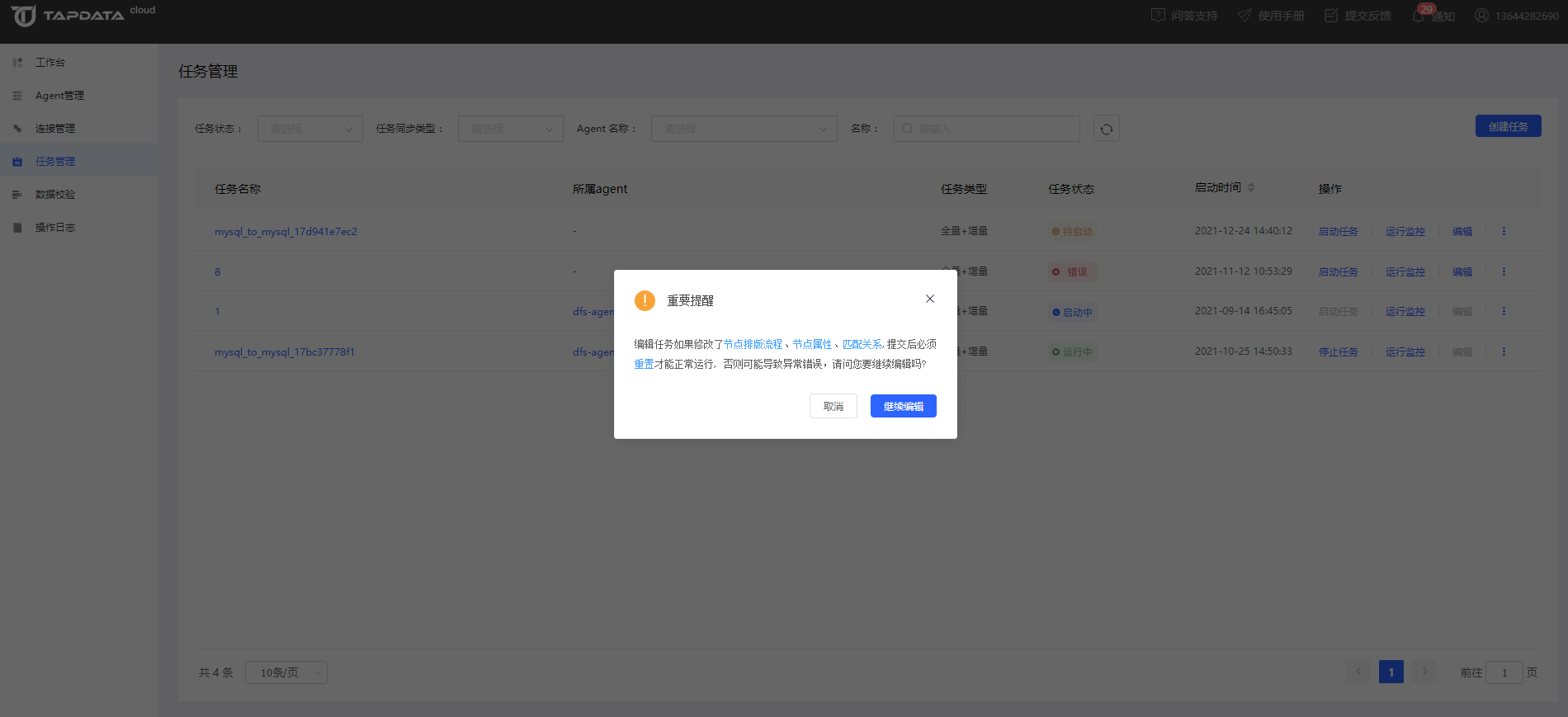 用户指南数据复制管理任务版本:2.x本页总览管理任务 任务创建完成后,您可以在任务列表中对任务进行监控和管理操作。 运行监控 单击任务操作栏的运行监控,即可打开任务执行页面,可查看任务执行的具体信息。 可查看到任务进度、运行日志、连接、历史运行记录、同步内容等信息。 编辑任务 点击任务编辑页面,可以对任务的内容和配置进行编辑调整。 复制任务 通过【复制】操作可以快速复制一个任务 重置任务 点击【重置】可以将任务同步进度清除 删除任务