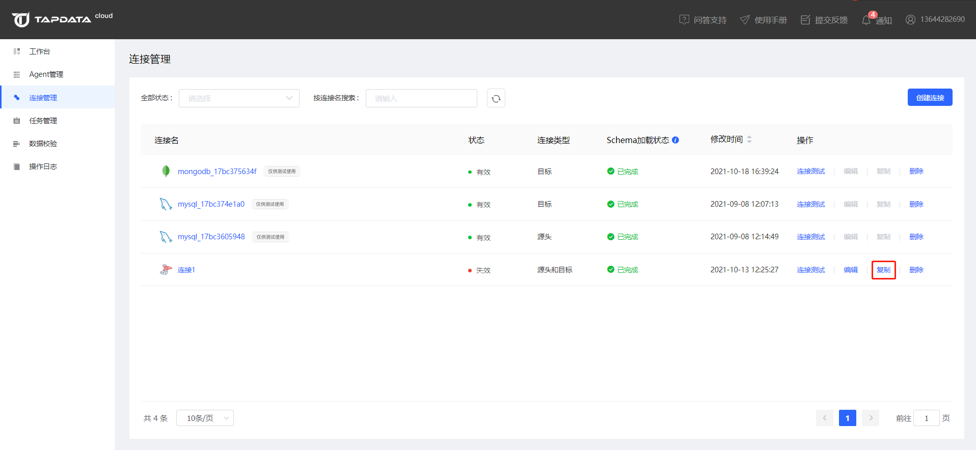 Tapdata Cloud 支持通过复制的方式快速创建连接。点击连接后的【复制】操作,可以复制一个与原连接一模一样的连接。