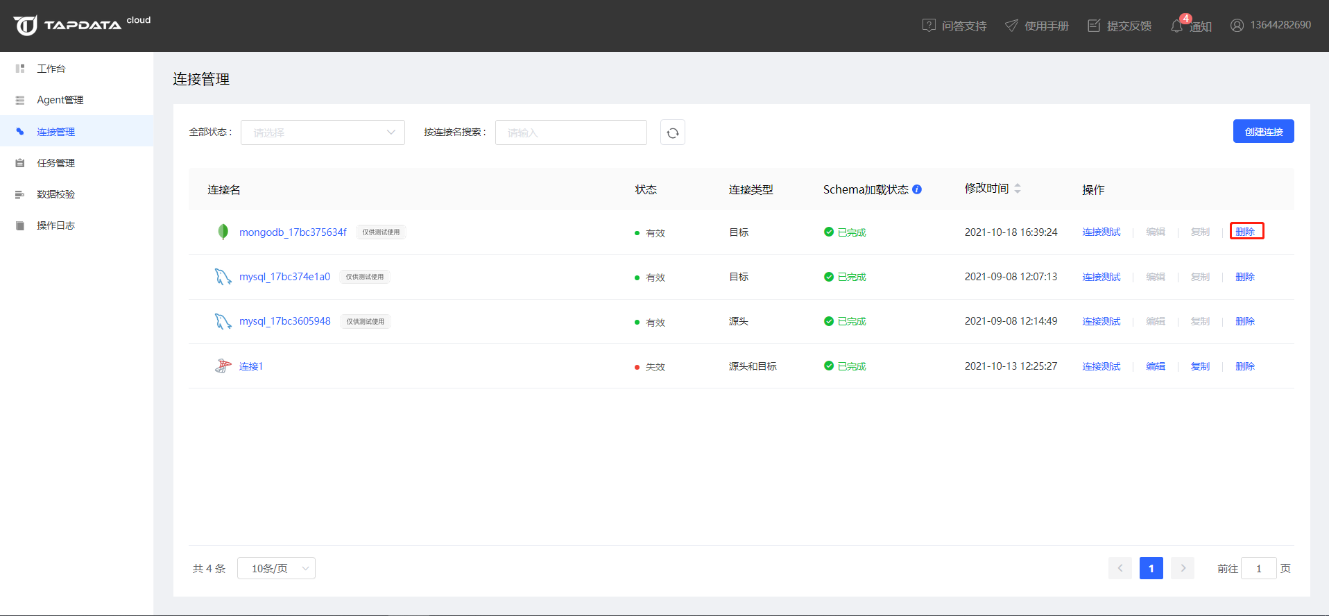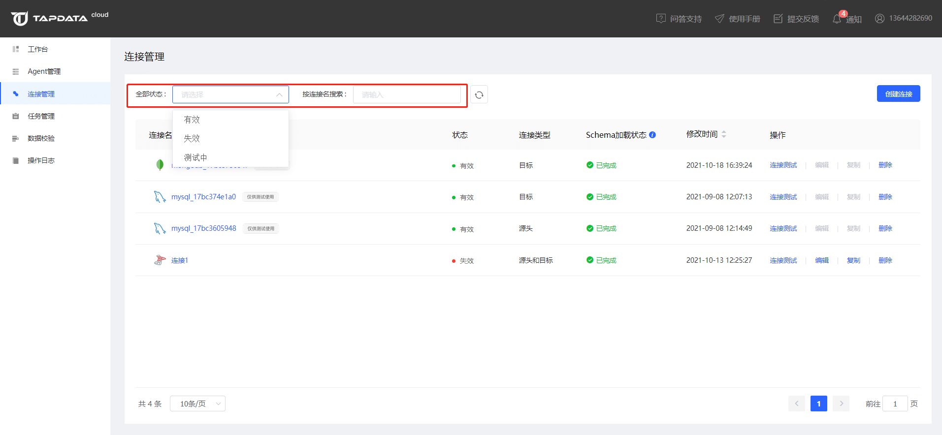 连接管理支持通过连接状态和连接名称对连接进行快速查询和筛选。