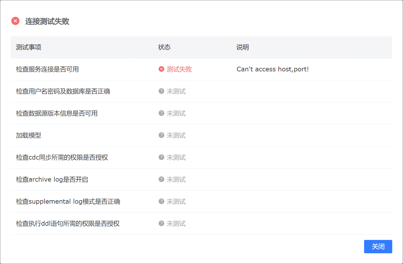 该测试项会对所填写的Oracle尝试连接,在网络不可达时Tapdata Agent会提示测试失败,此时请检查网络连通性,如:本地iptables配置、网络中的ACL限制等。