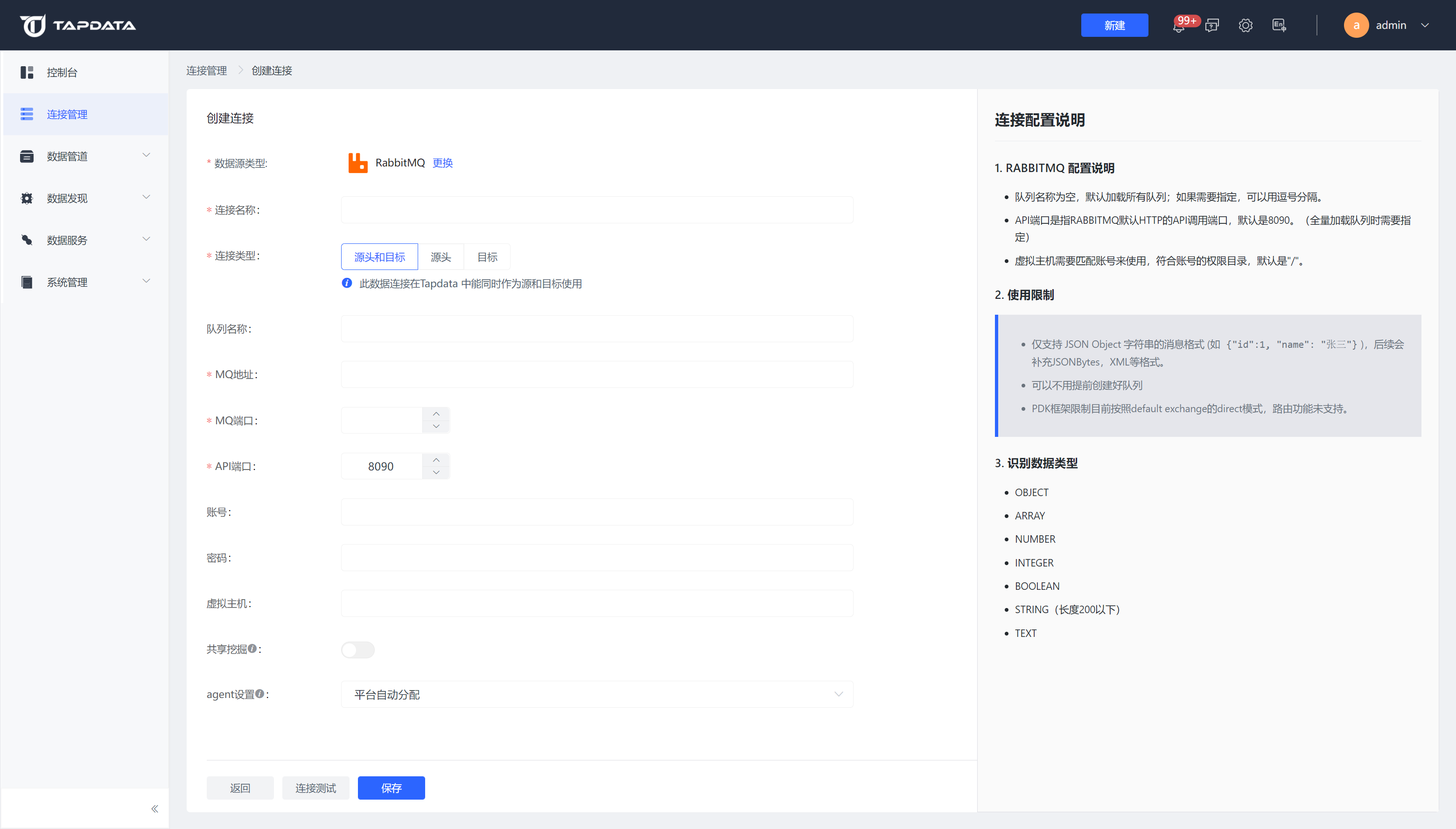 目标:此数据连接在Tapdata 中只能作为目标使用,不能作用为源