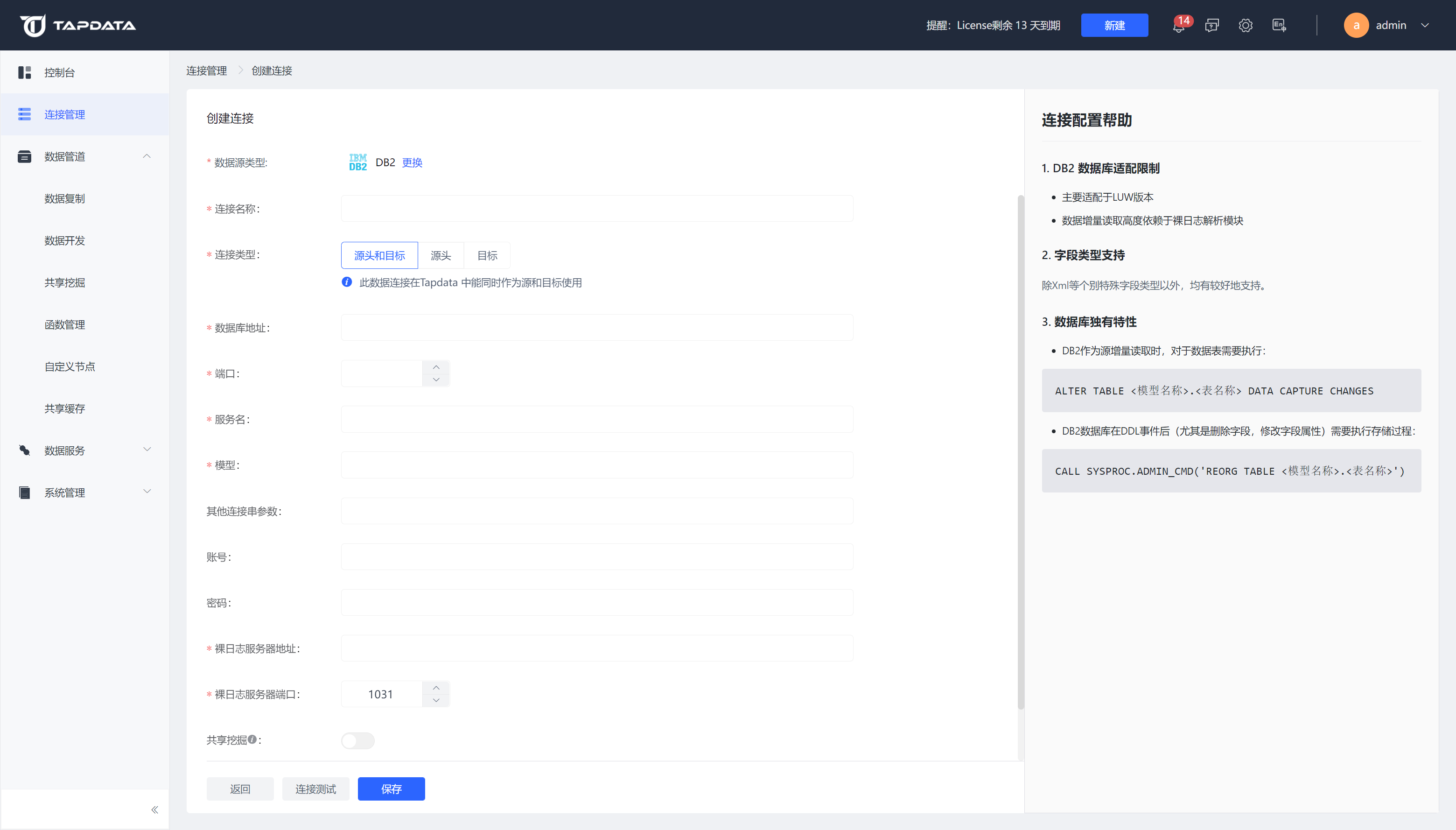 源头:此数据连接在Tapdata 中只能作为源使用,不能作用为目标