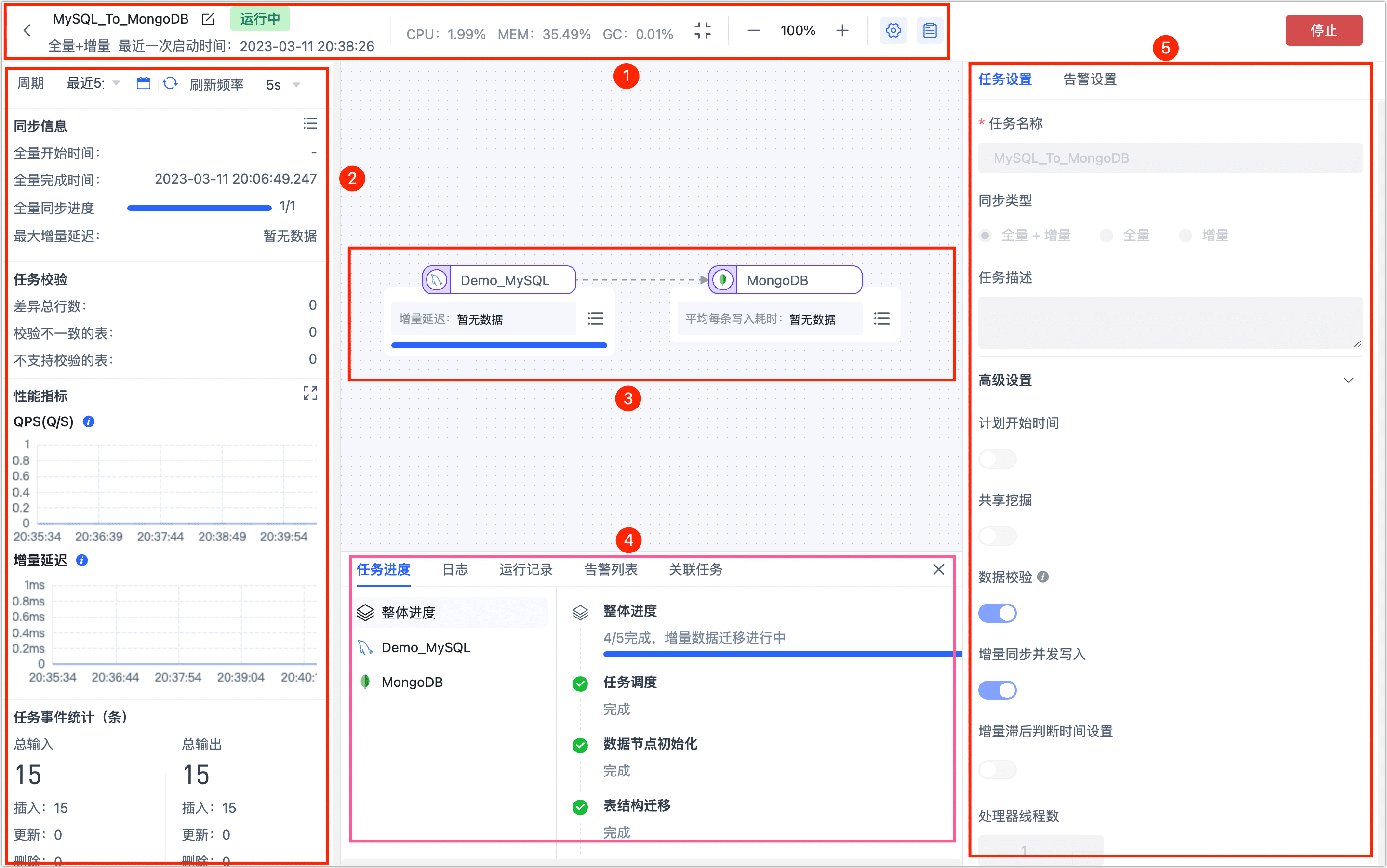 - 增量延迟:事件从源库生成到经任务处理完成写入目标的延迟时间,当有多个目标时只统计最大的增量延迟时间,单位为毫秒。