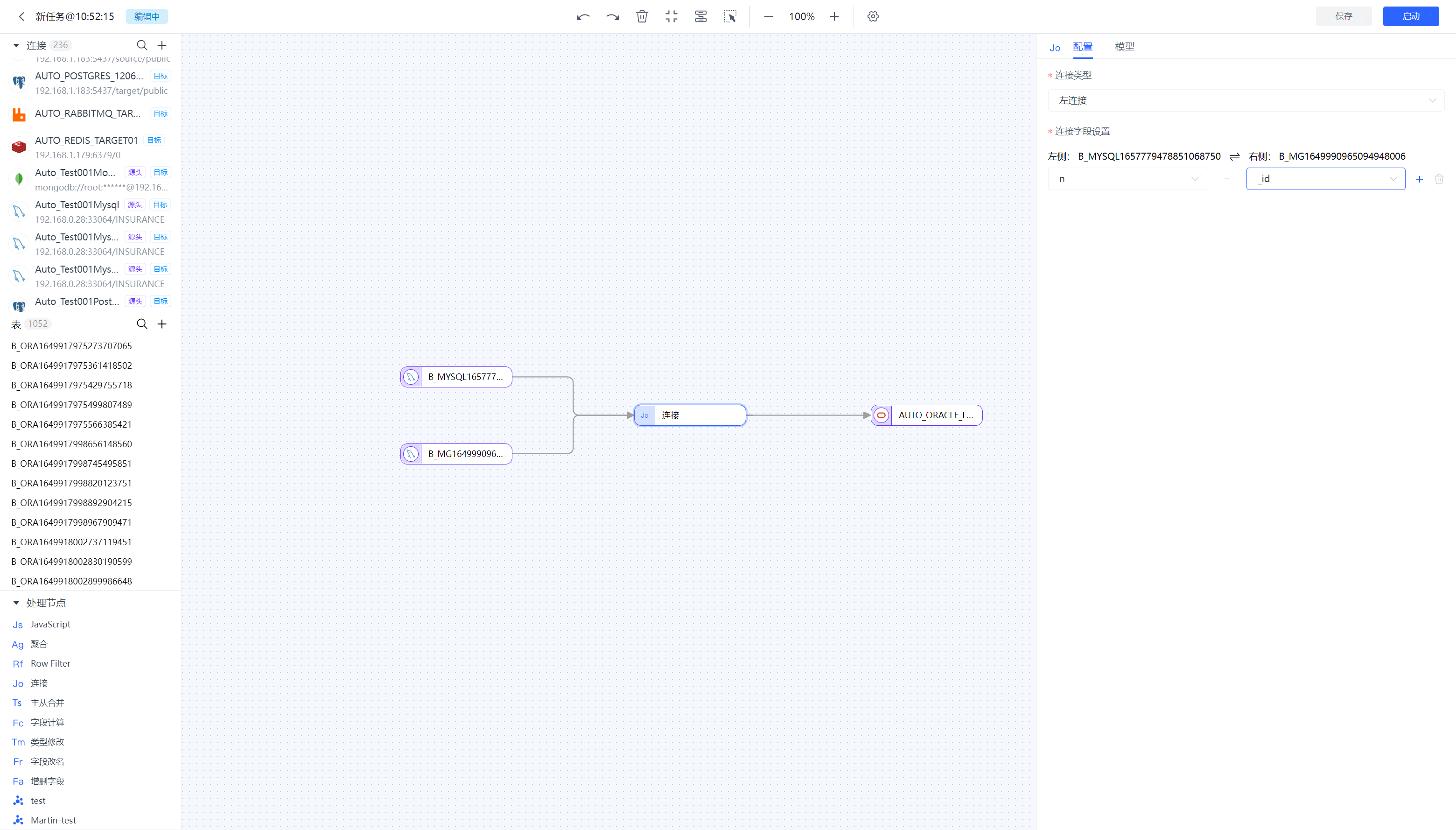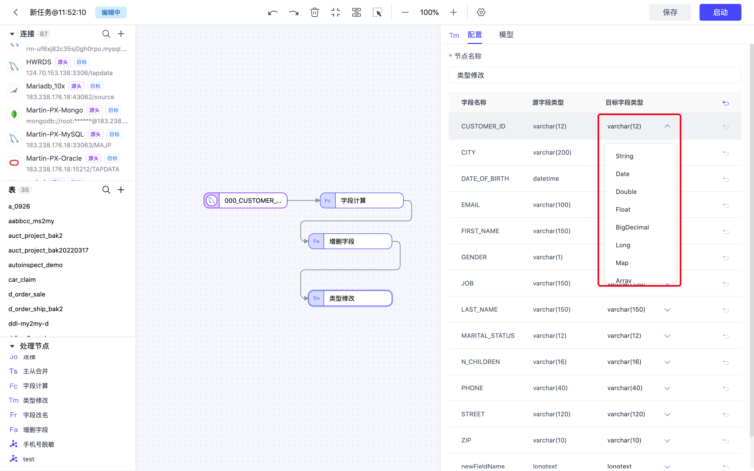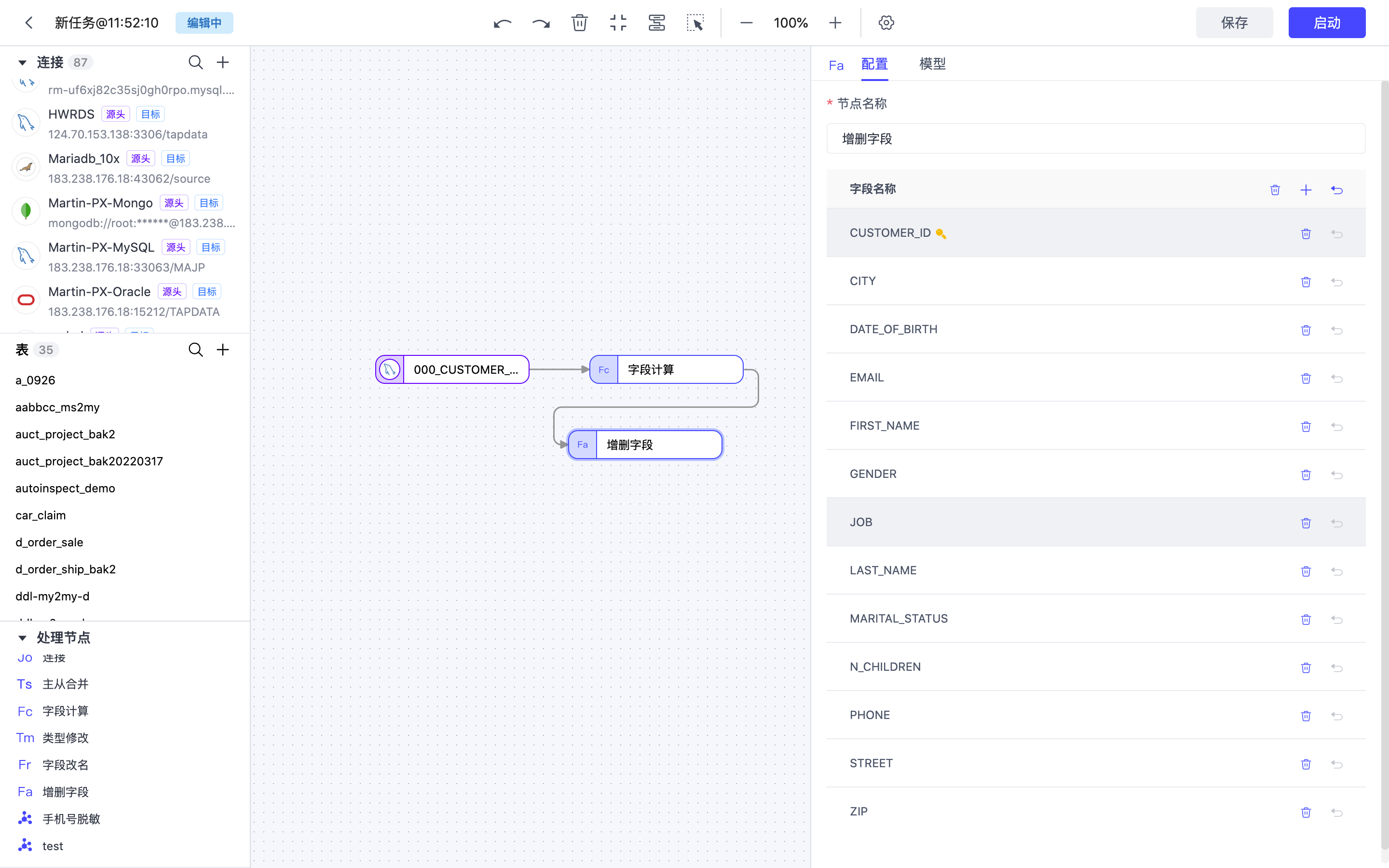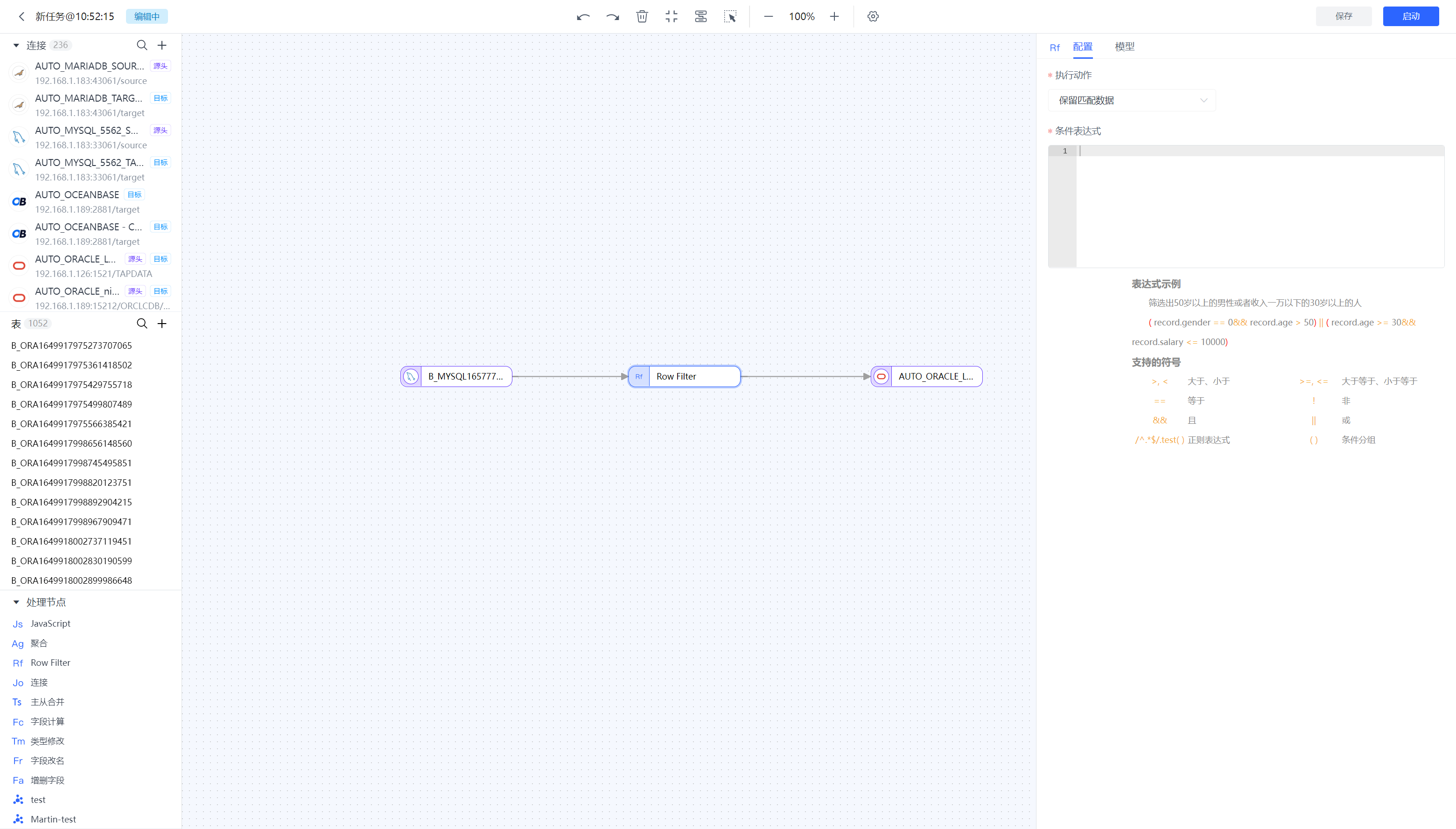 Tapdata 支持在开发任务中添加处理节点,满足对数据进行过滤、字段调整等需求。