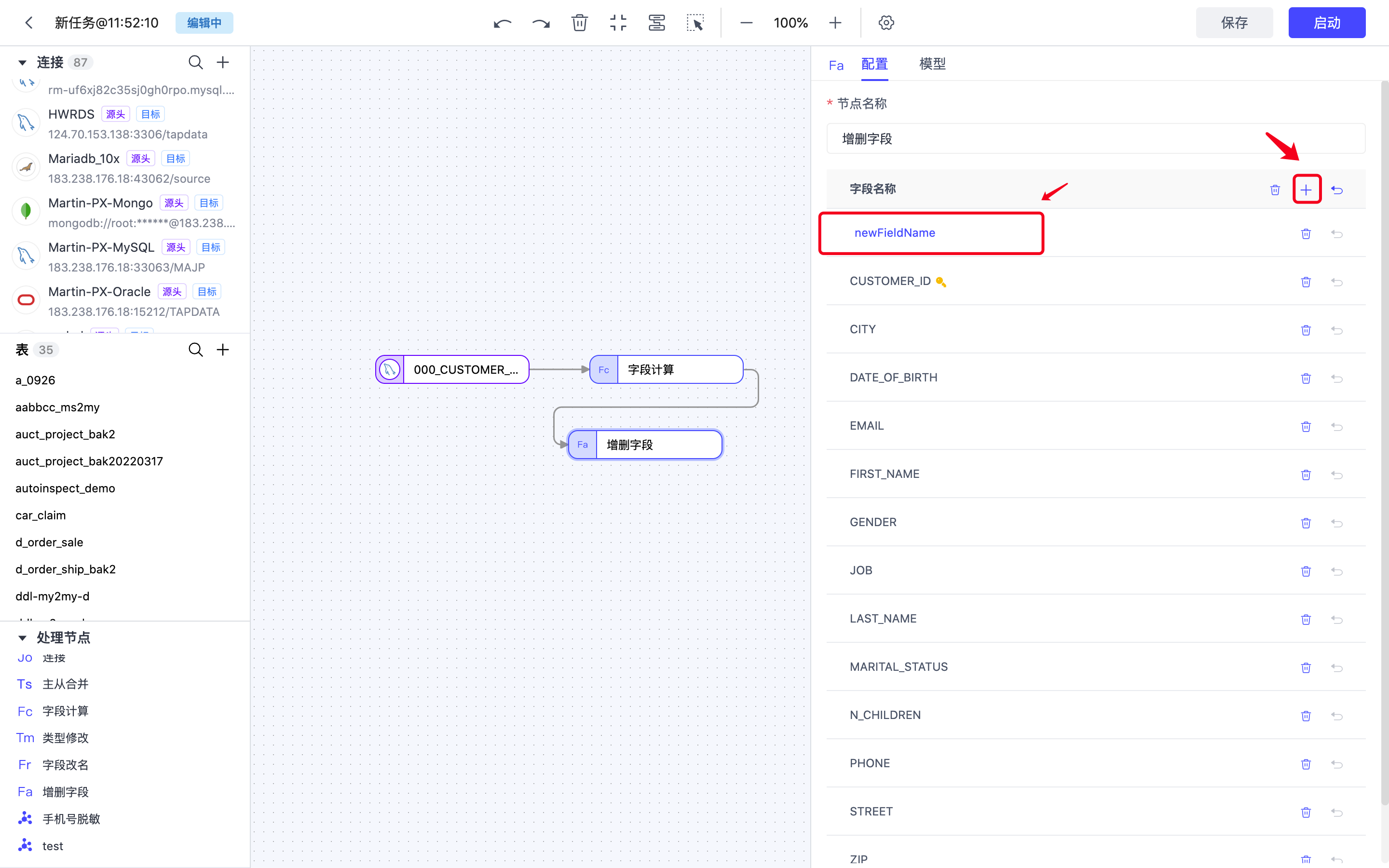 增删字段主要用来增加新的字段或者删除已有字段,将【增删字段】节点添加到画布,然后点击【配置】可以打开节点的配置页面
