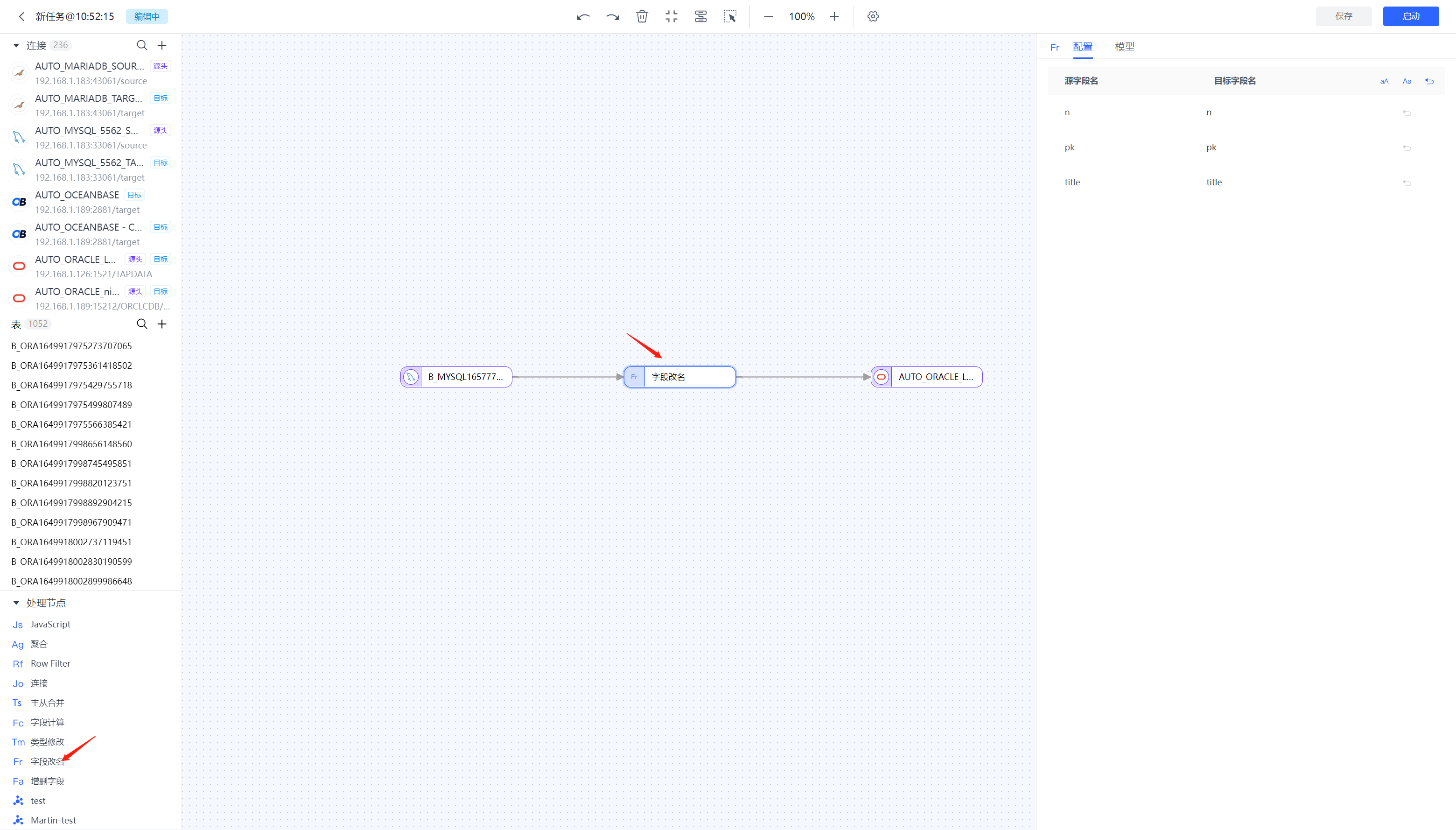 首先从左侧处理节点区域拖出一个字段改名界面与源节点和目标节点相连,然后点击该处理节点进行修改操作