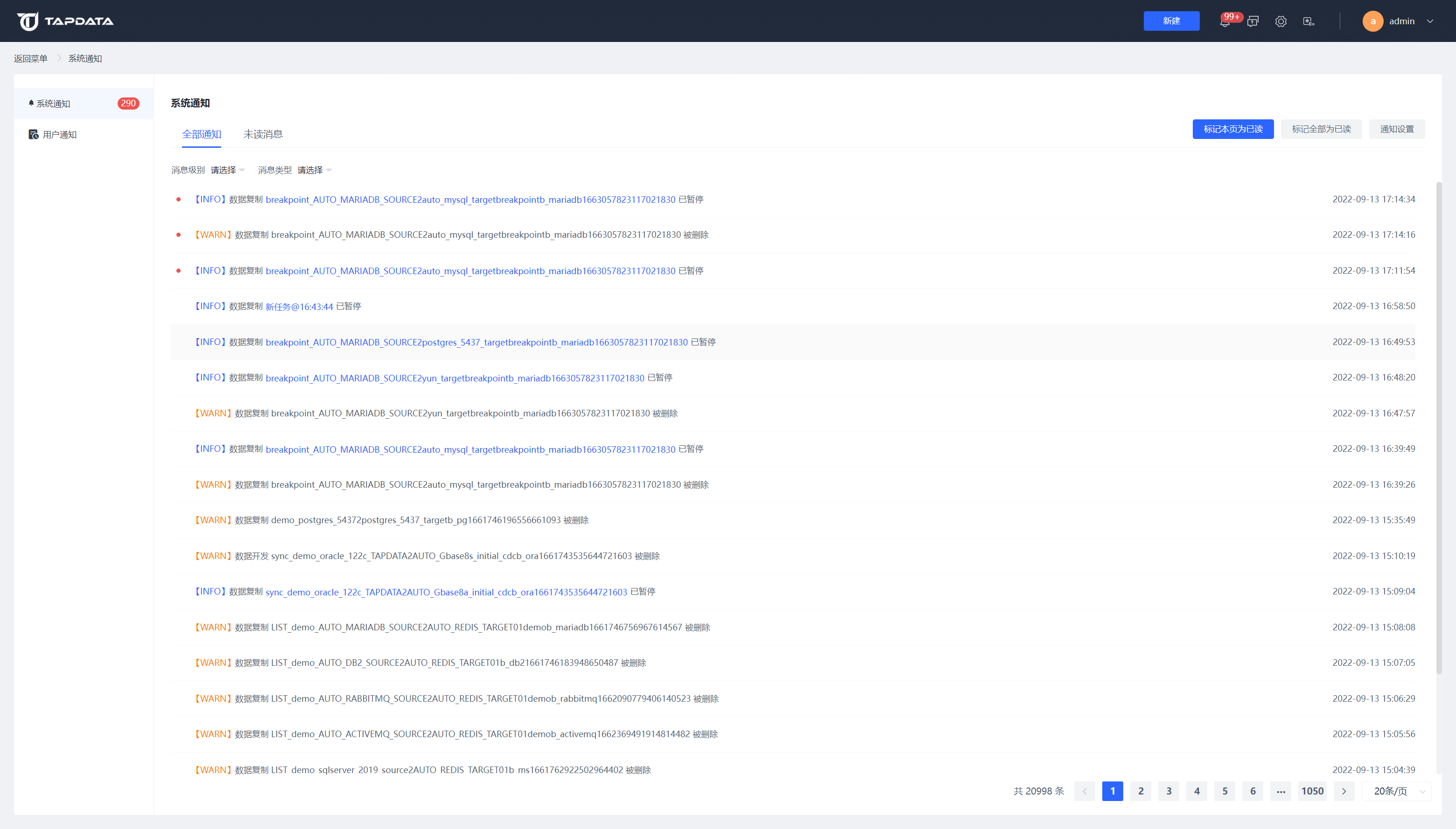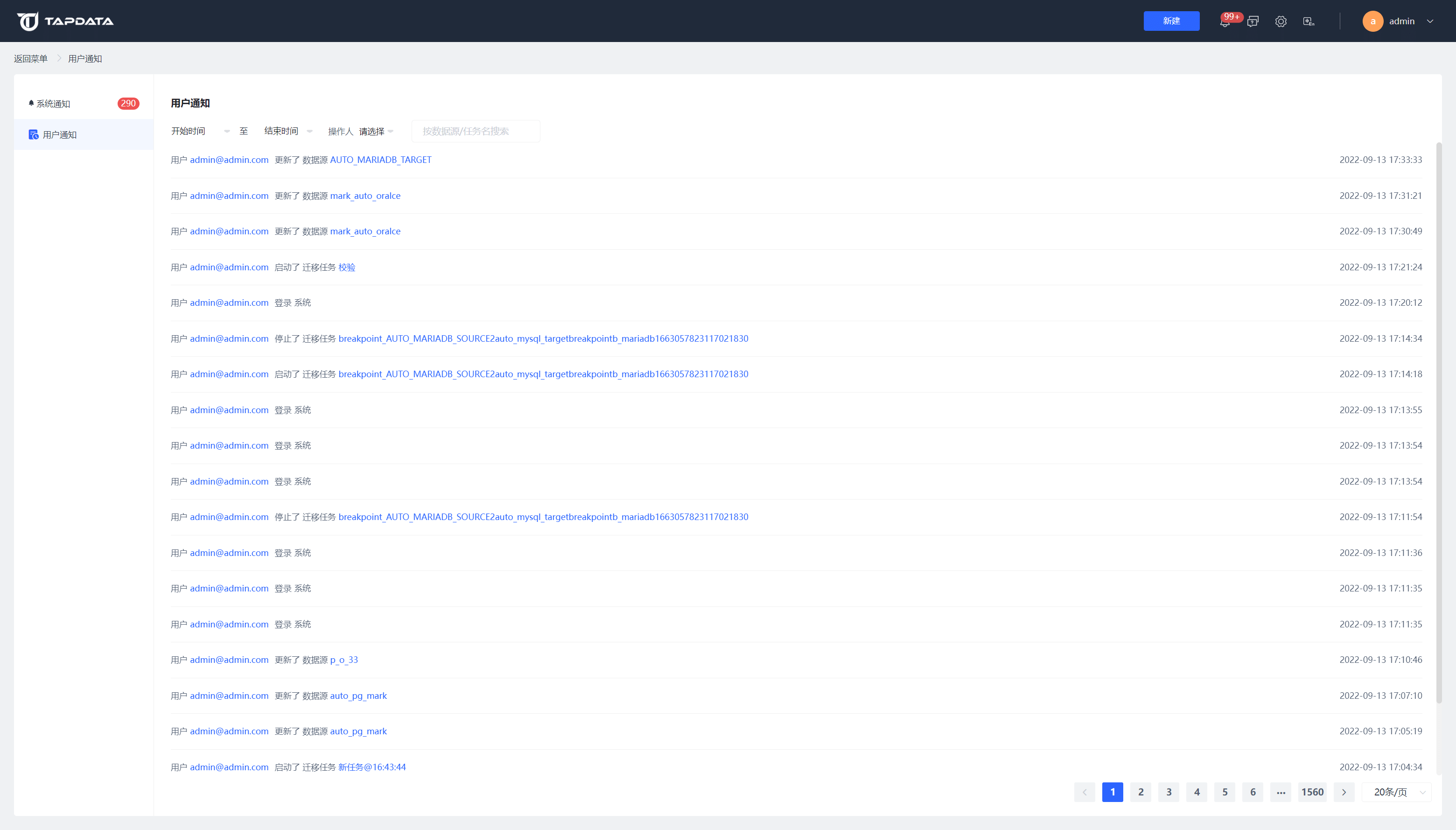 在用户通知页面,可以通过数据源或者任务名称、操作时间和操作人对用户通知进行快速筛选。
