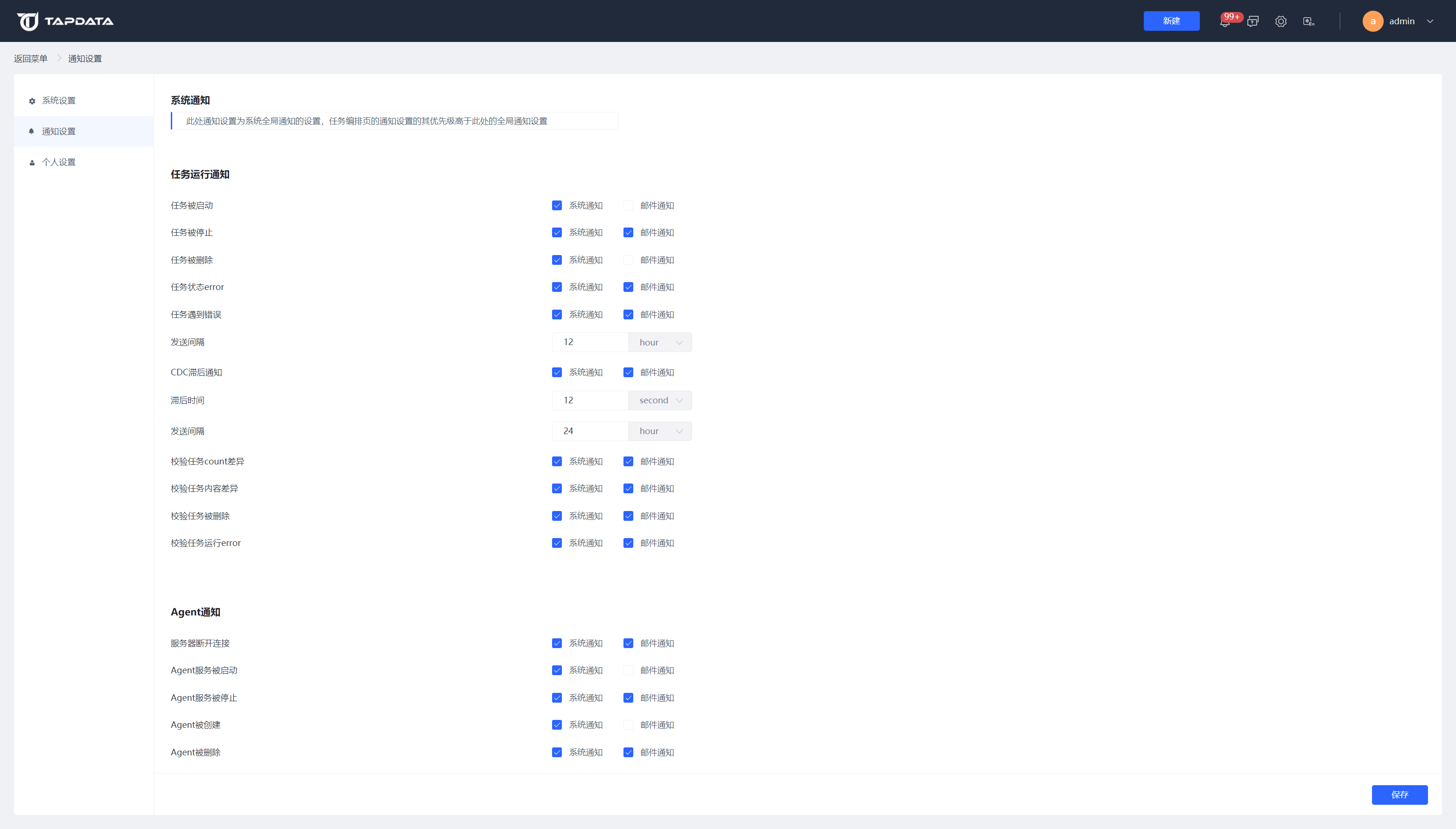 系统通知功能主要是系统根据用户自定义的通知规则设置,自动触发发送的通知。主要包括任务运行通知和Agent通知两种类型,具体包含的通知项有: