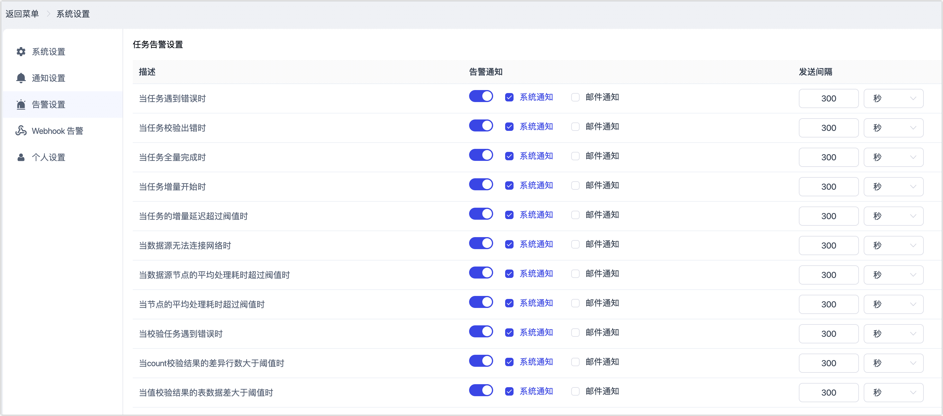 TapData 支持自定义系统和告警设置,同时支持通过 Webhook 对接第三方平台,帮助您快速掌握任务运行状态。