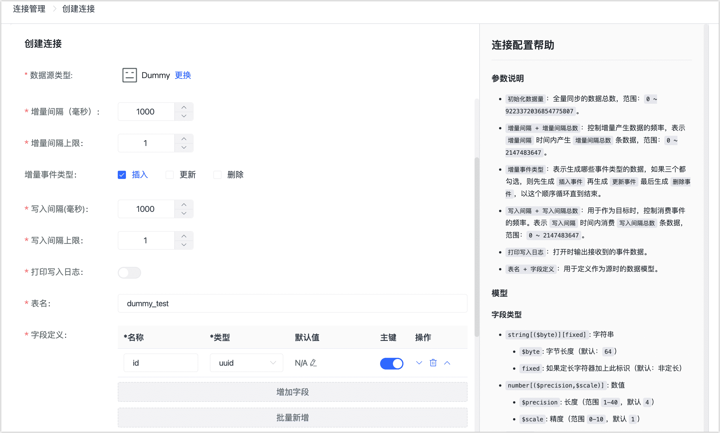 表名、字段定义:定义作为源头时表的结构,支持批量新增字段。