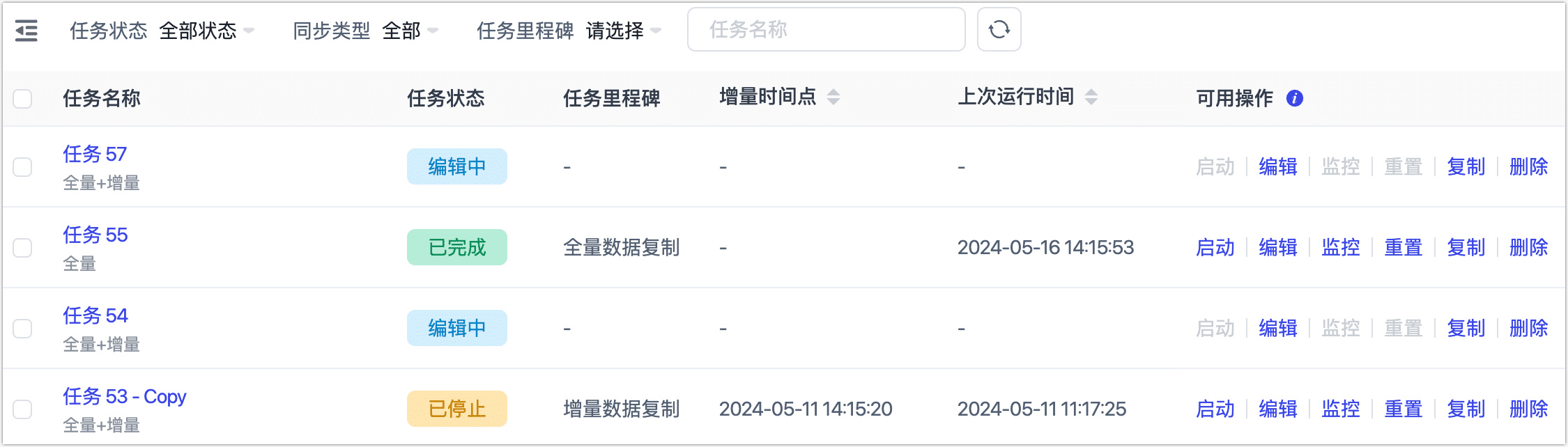 | 启动/停止 | 停止任务后,下次启动将基于上次停止的增量时间点继续复制数据。 |