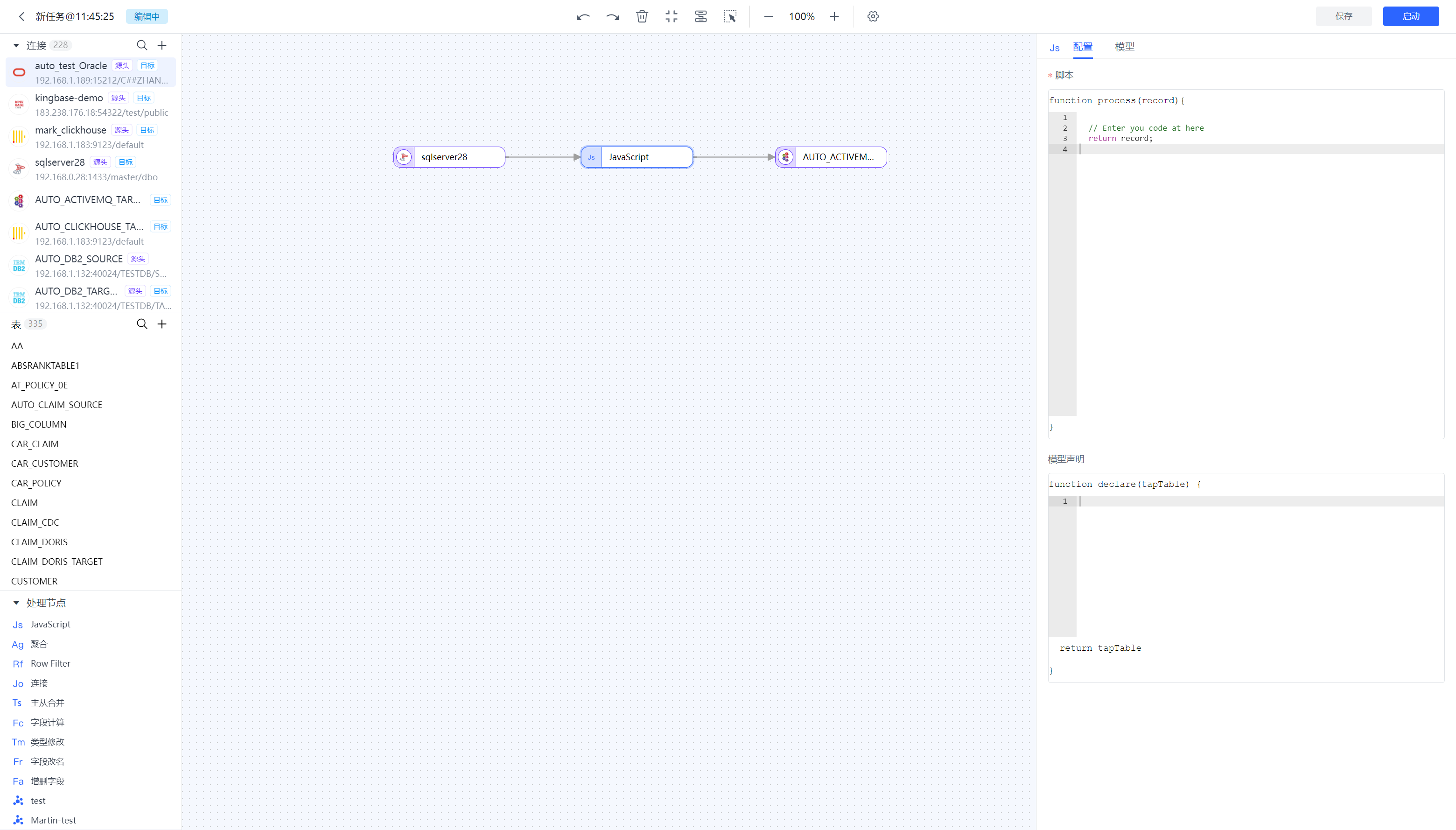 支持通过 JavaScript 脚本或者 Java 代码对数据进行处理,编写代码时需先检测是否与源节点及目标节点相连,若未相连则无法编辑代码。