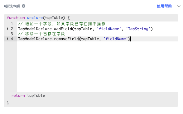 针对JS节点,Tapdata会通过采样数据试运行的方式来推演节点的模型信息。如果发现推演出的模型不准确,丢失或者多了某些字段,可以通过模型声明显式的来定义模型里的字段信息。