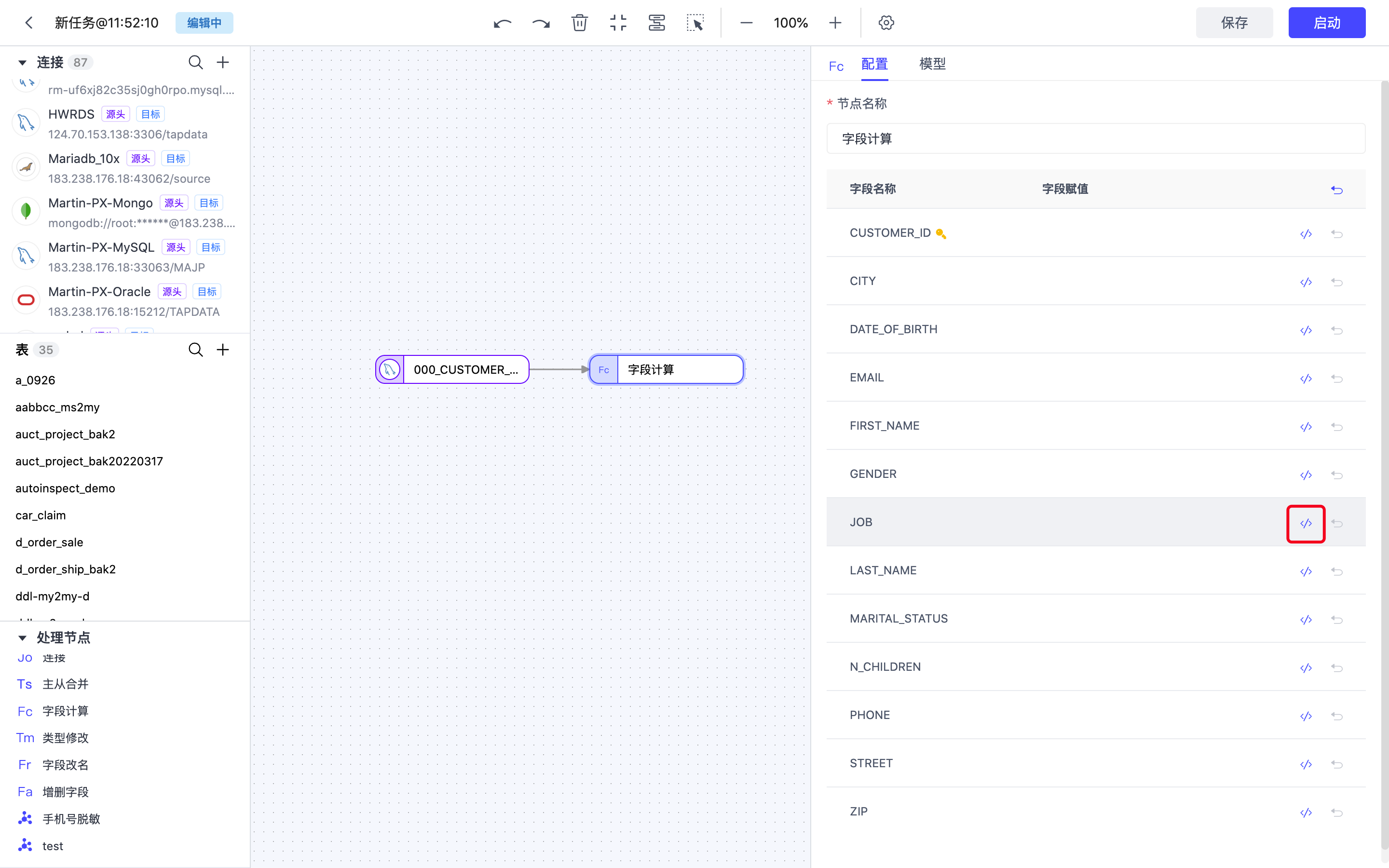 TapData 支持在数据复制/开发任务中添加处理节点,满足对数据进行过滤、字段调整等需求。