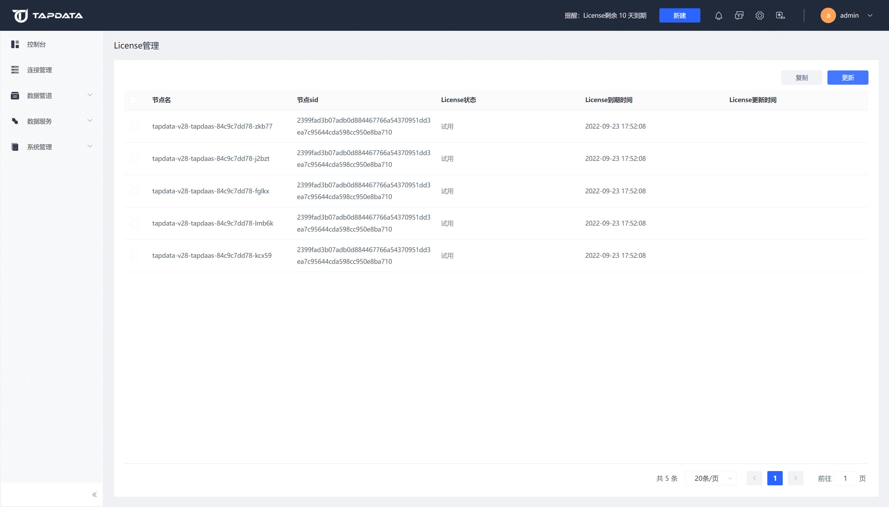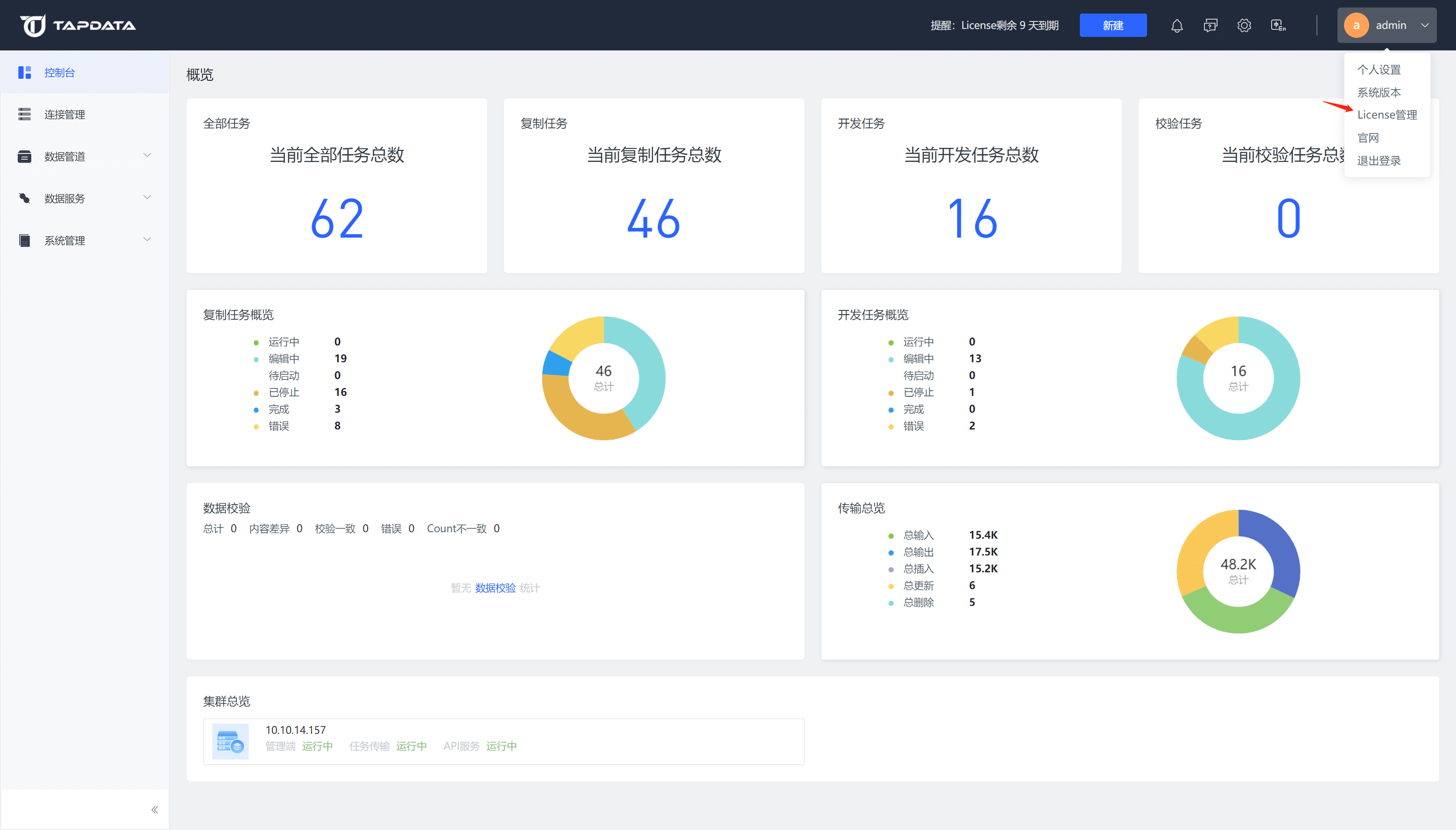 用户指南其他设置管理 License版本:4.x管理 License TapData Enterprise 可部署在您的本地数据中心,适合对数据敏感性或网络隔离有严格要求的场景,可服务于构建实时数仓 ,实现实时数据交换,数据迁移等场景。 在页面右上角,单击账户信息,然后单击 License 管理 可进入管理界面。 可对 License 进行复制及更新操作